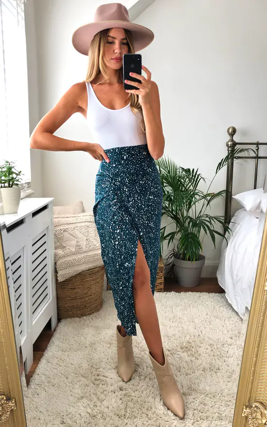 Featuring a wrap front, cute print and midi length with a matching side tie, this skirt is an essential collection of this season’s wardrobe!