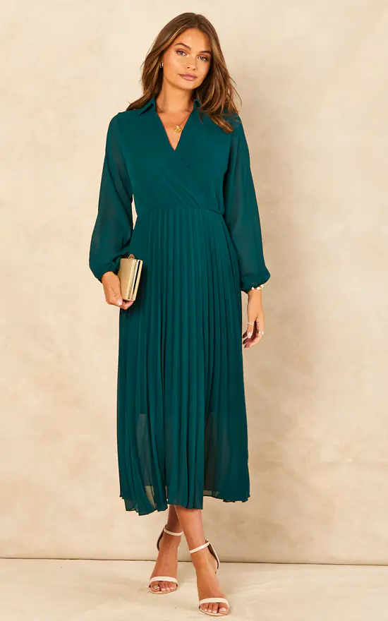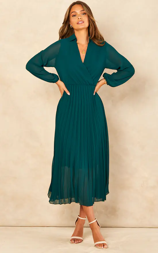 One thing that will never go out of style are pleated dresses. Our Amryn dress is no different. It features a pleated bottom, along with a mesh layer, a wrap front, and a collared neckline. Stylish but also professional, this dress can be worn when having a cocktail with friends after work.