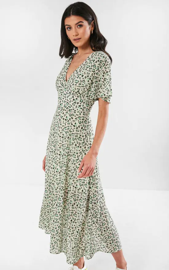 In a classic midi length with a v neckline and animal print, team this dress with trainers and a denim jacket.
