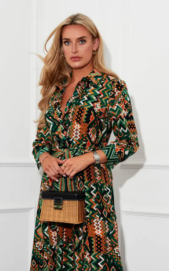 Unleash your tribal instinct in our Angela Green & Orange Shirt Maxi Dress! Featuring a intricate print design, 3/4 sleeve and belt to cinch you in at the waist, creating a gorgeous silhouette. Dress this classic style up or down for every occasion this season!