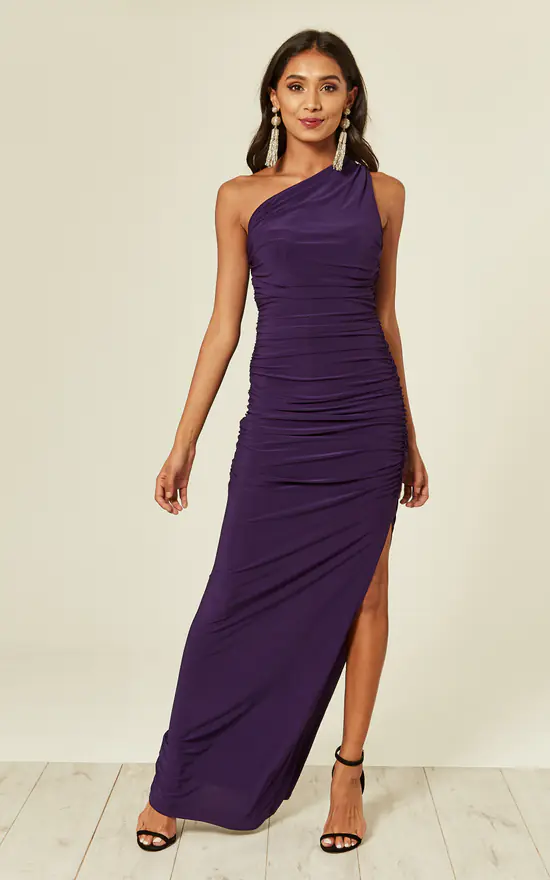 Feel like a Greek Goddess in this flattering one shoulder ruched dress in Cadbury Purple. Perfect for evening parties and bridesmaids. The curve hugging design flows over your figure for a fabulous silhouette
