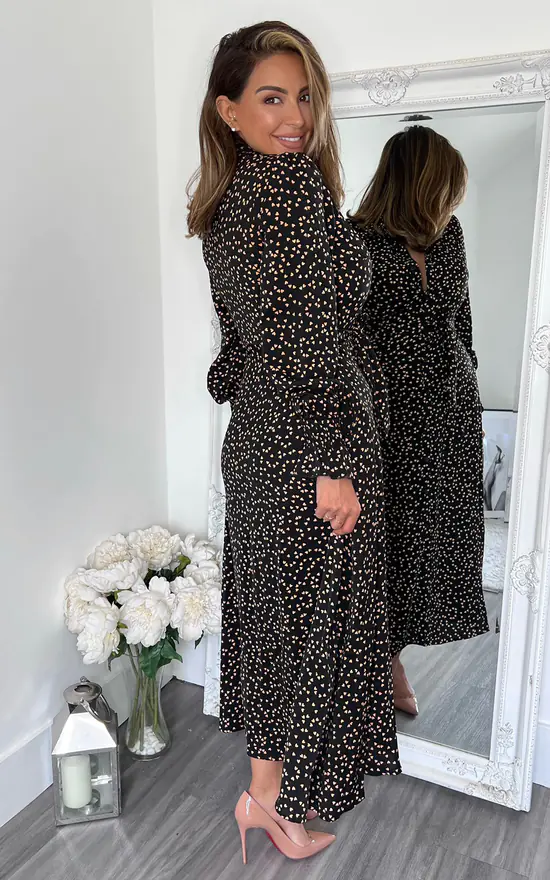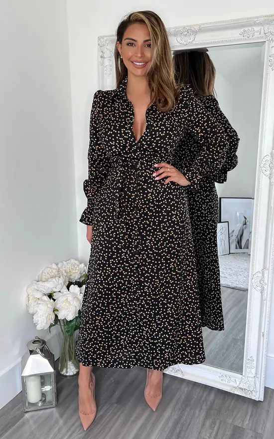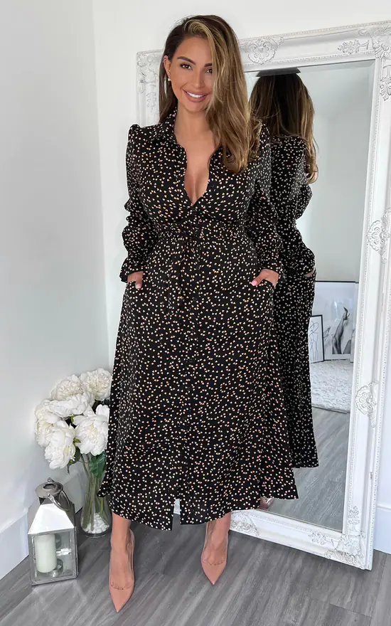 Stay on trend in our Black Heart Printed Tie Waist Midi Shirt Dress. Featuring a button up shirt like style top, tie waist, long elasticated cuff sleeves, a midi length skirt and pockets! Pair with some strappy heels and a cute bag to complete the look!