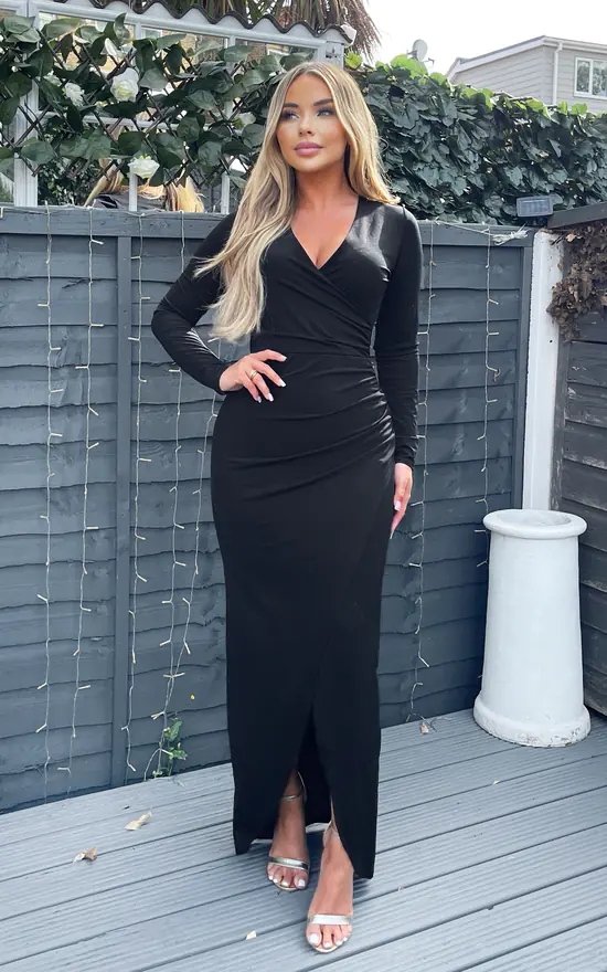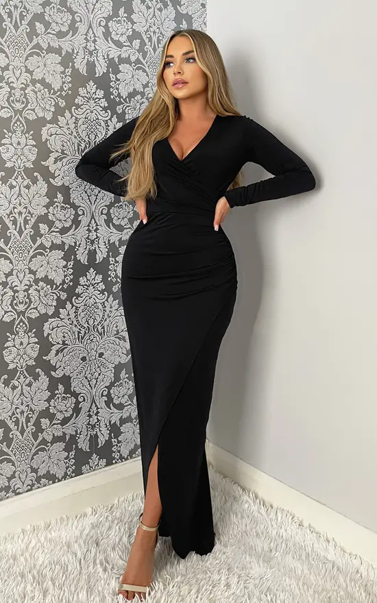 Our Black Long Sleeve Wrap Over Maxi Dress is right on trend this season! Featuring a v-neck wrap over top, long sleeves and a wrap over skirt with split. Pair with barely there heels and a some simple jewellery for a sophisticated look.