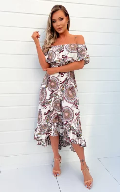 Look sophisticated in our Brown And Navy Printed Long Sleeve Midi Dress. Featuring a v neck, long deep cuffed sleeves, a split leg and zip up back! Pair with some black heels and a mini handbag to complete the look!