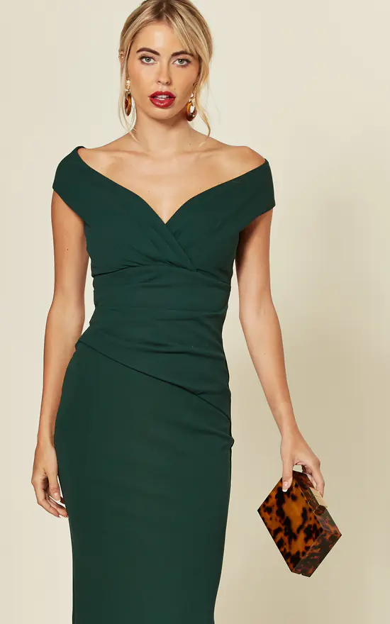 Its pleated detailing on the bodice, and its stretchy fabric makes this dress figure flattering, showing off your sexy silhouette. In its regal emerald green colour, this dress is the perfect choice for any occasion, any season, anywhere! Team with some gold heels, matching clutch and some dazzling jewellery, and feel like the queen you are.