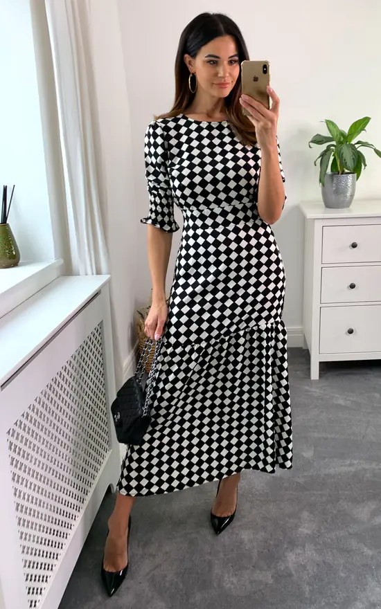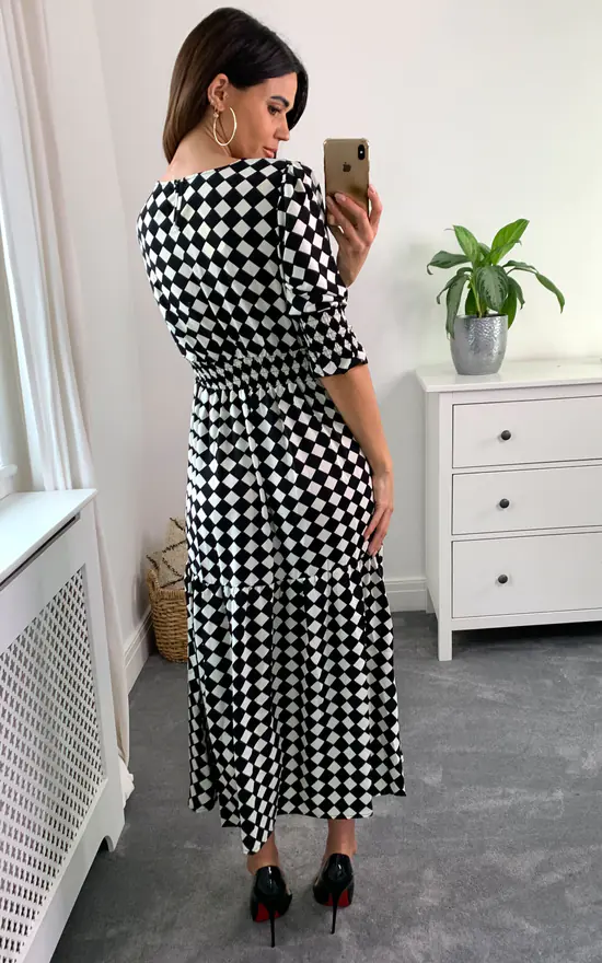 This black and white diamond printed dress is a ‘must have’ item in your wardrobe as a transitional piece. With a smocked sleeves and tiered layer, this dress can be worn both at day and night.