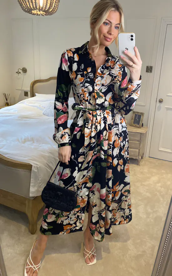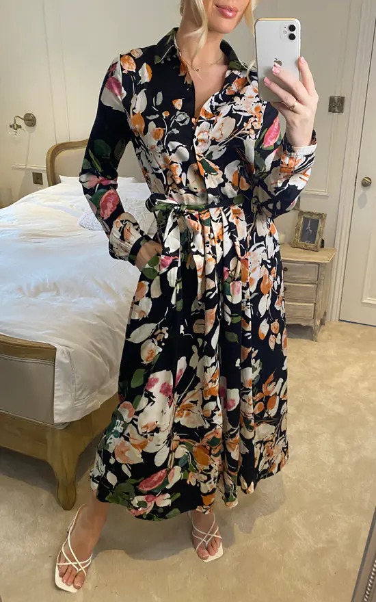 This dress is made from luxury cotton satin printed with flowers and leaves, it has buttons through the front and slightly flared hem.
