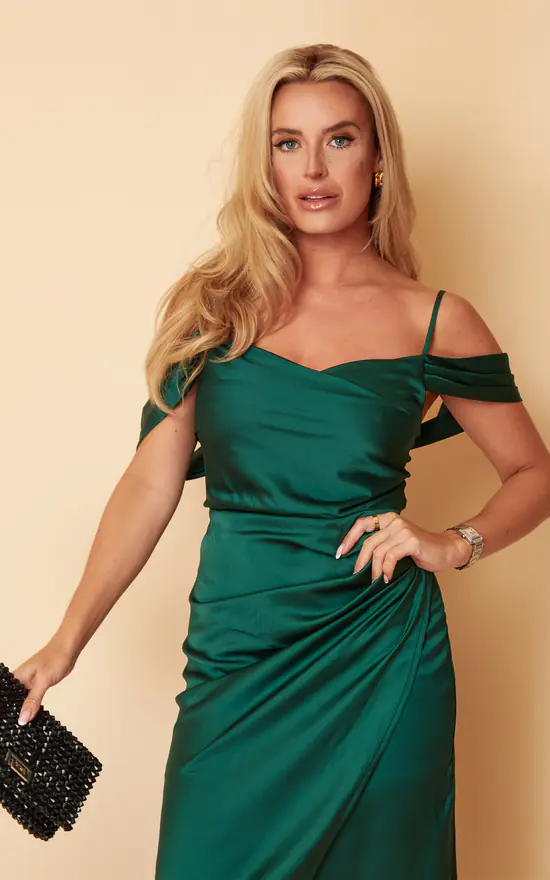 Step into the party season in style! Stand out in our Camila Emerald Wrap Over Midi Dress this season in this gorgeous Emerald colour. Style up for your special occasion with some accessories for this chic style.