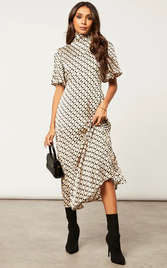 Want a dress that is suitable for the workplace and then later on when having casual drinks? Look no further than the Cowl Neck Midi Dress with Angel Sleeve. With a waist belt, back zip, a geo print and and a playful cowl neck, this dress has all the elements you need! Match with heeled shoes.