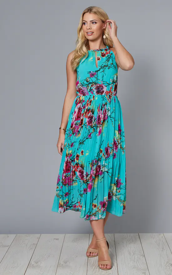 Exclusively by Blue Vanilla. Stand out from the crowd with this colourful, floral midi dress! Keyhole detail on front and back with a plaited tie fastening at the neck. The dress also has an elasticated waist. Compliment with wedges for the ultimate glamorous summer look!