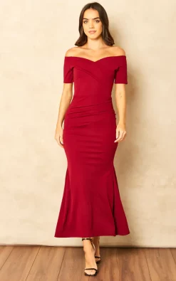 Bardot off shoulder frill midi dress from Feverfish ,this design has a proportion balancing off shoulder neckline with a asymmetric frill detail skirt,also featuring a tie belt at the waist this chic design is perfect for a formal occasion and is made in stretch crepe fabric.