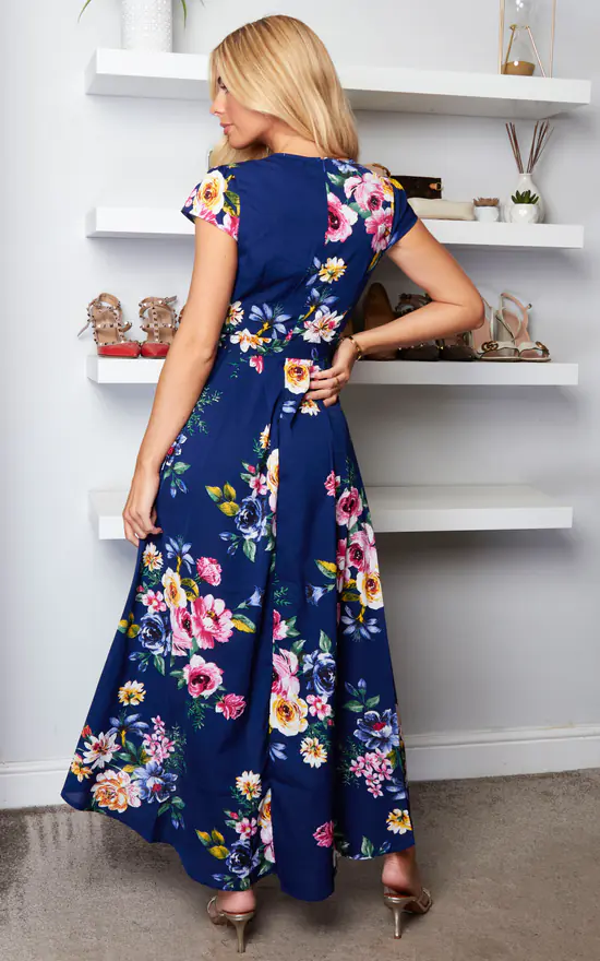 Designed with short sleeves and a flattering wrap bodice that tapers with a self-tie waist. The floral printed fabric falls into an flowing dip hem skirt. This Mela dress is a stunner for all those summer invites.