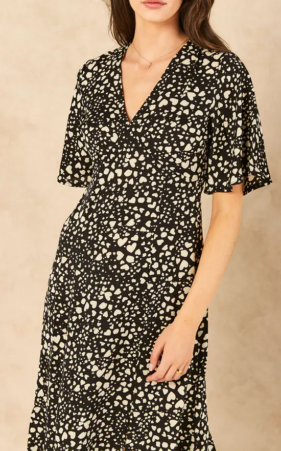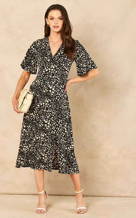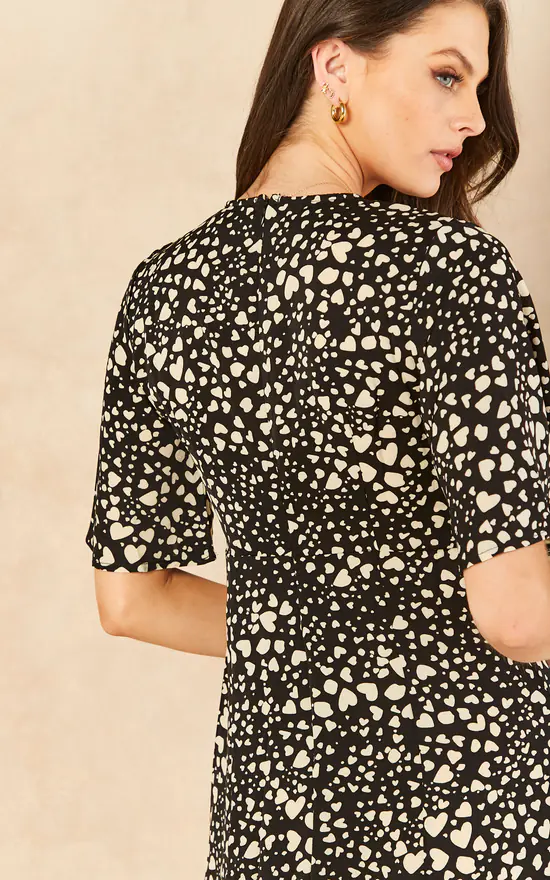 Make a statement in this heart print dress. With angel sleeves, V neck and spilt leg detail, this dress is a great addition to your wardrobe. Can be worn with flats during the day and heels for the evening. The perfect day to night dress.