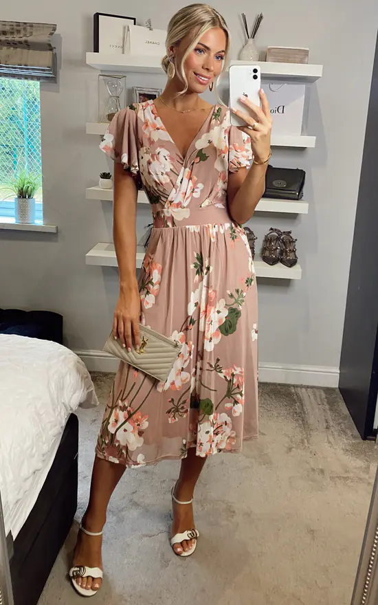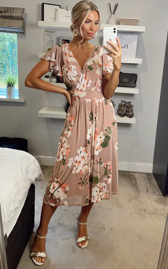 Exclusively by Jolie Moi. Easy to wear in an A-line silhouette with a flared hem, this midi dress from Jolie Moi boasts a floral flourish for added appeal. Framed with a flattering v-neckline and cap sleeves, this piece wears well with your favorite heels and jewellery for all-out glamour.