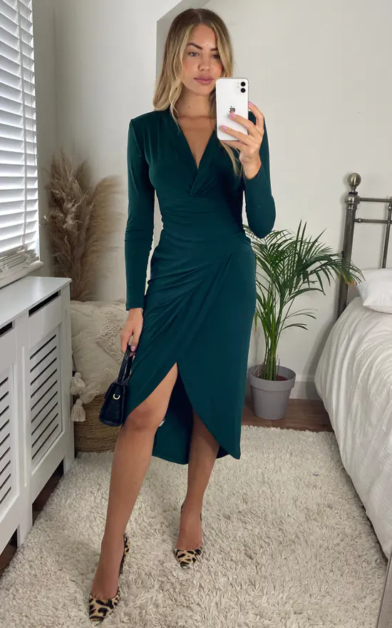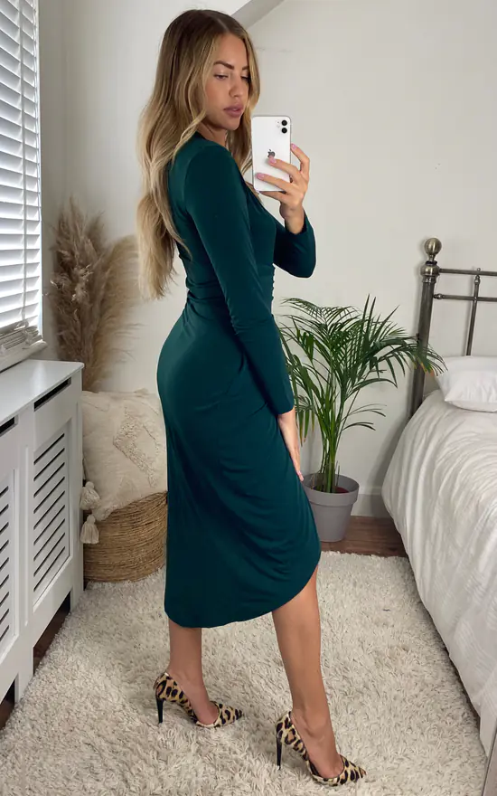 Jenerique’s Long Sleeve Midi Wrap Style Dress is now available in this beautiful petrol green colour. It’s made out of a stretchy fabric which is perfect for staying comfy while looking stylish this season.