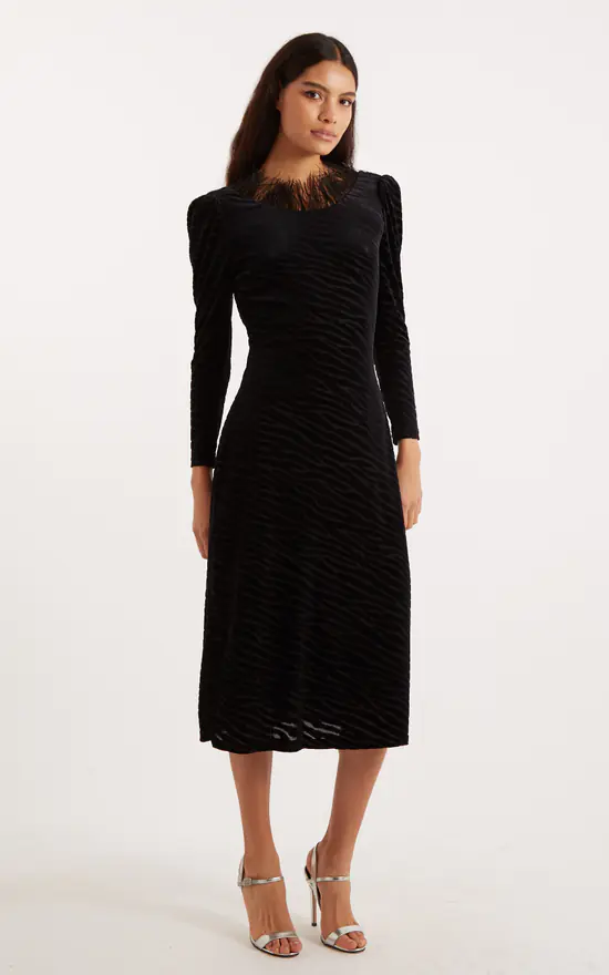 Krystel is crafted in a soft velvet devore zebra design jersey and features a low (bra friendly) V back, with a neckline bedecked with feathers. Adding that Hollywood glamour to any occasion.