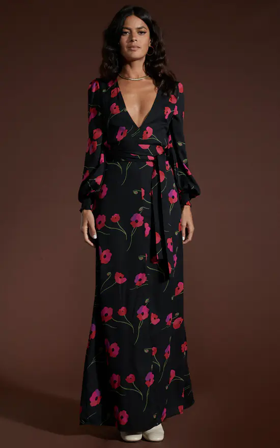 A dress worth making plans for! Features a standout neckline and striking poppy print