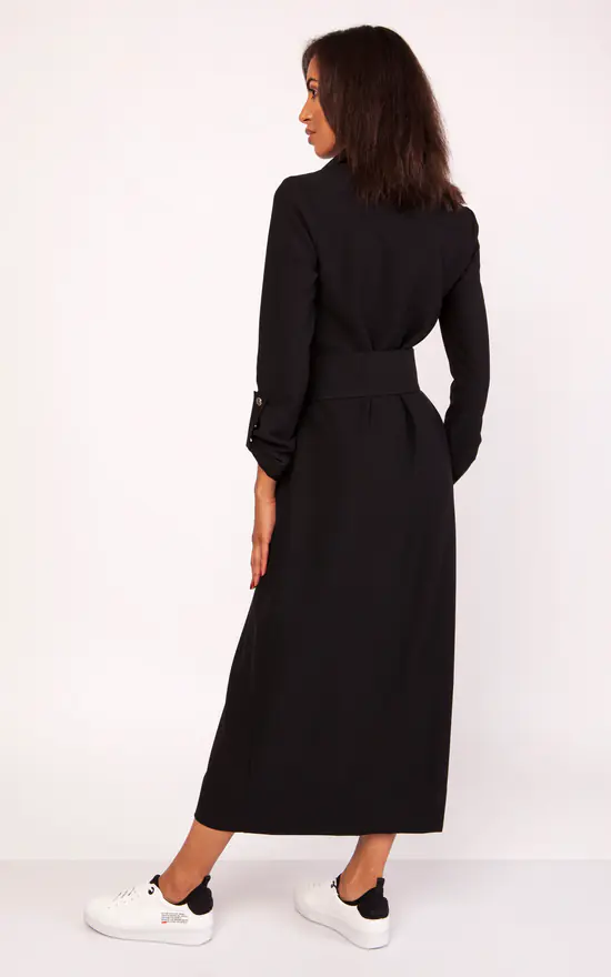 A maxi military-style black dress is a perfect option for everyday style. The dress is fastened with poppers, and includes decorative pockets as well as adjustable sleeves.