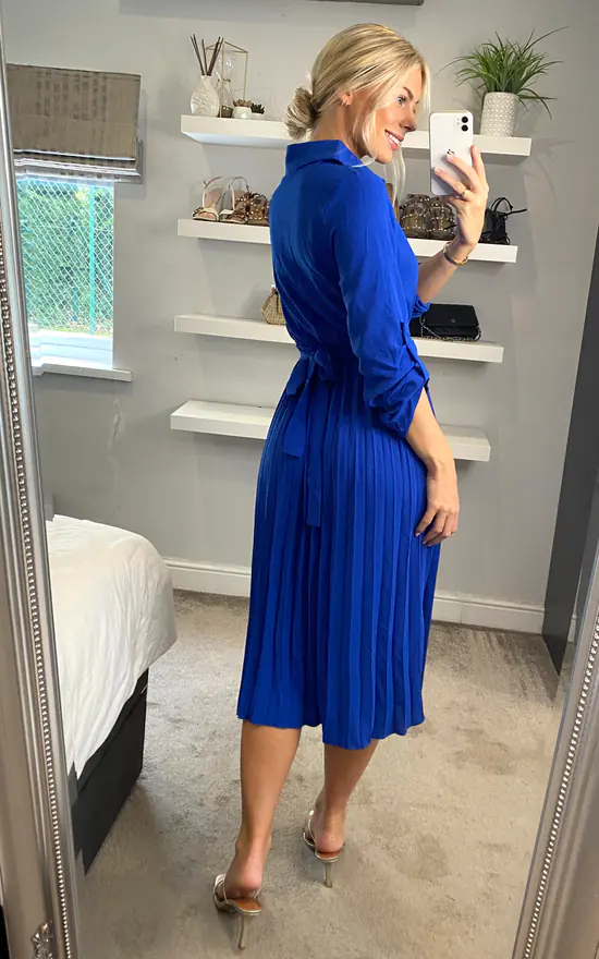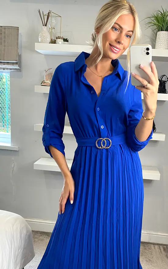 The pleated midi skirt, gold hardware and bright blue on this Mela dress is the only way to go for any plans this season. The button up front, 3/4 sleeves and with tie waist with the gold interlocked design belt has the ultimate workwear to weekend vibes.