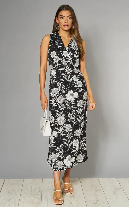 Tone down your new look with this monochrome midi dress. Designed with a sleek floral print, itβs been updated with spots, a crossover design and a slinky tie running around the waist. The soft fabric and sleeveless style make it a comfortable choice, with a zip on the back bringing it to the perfect close.