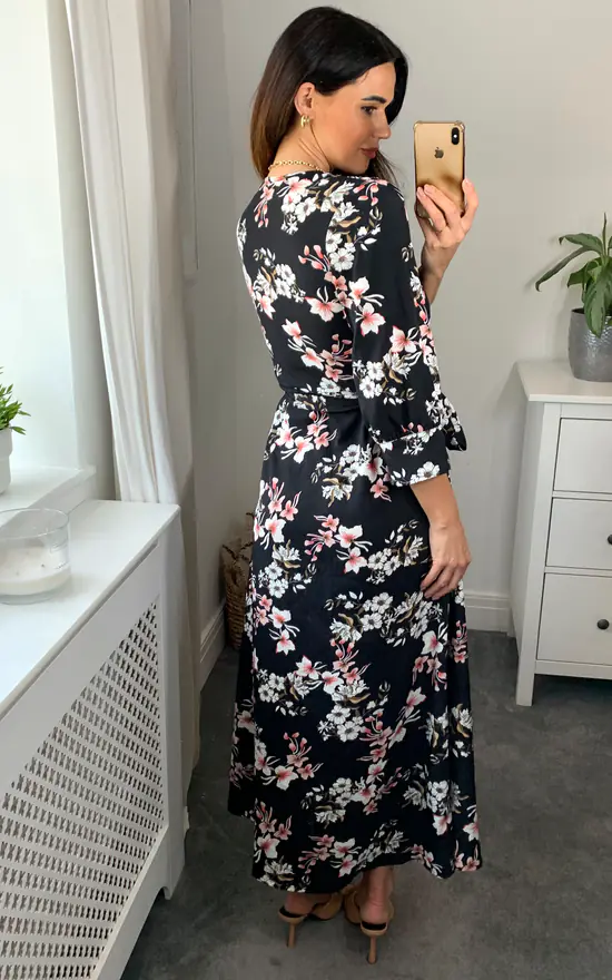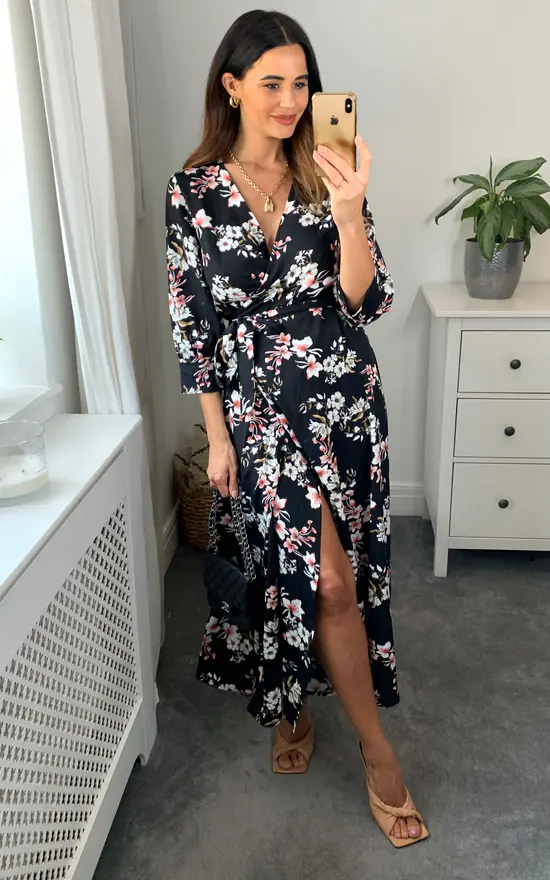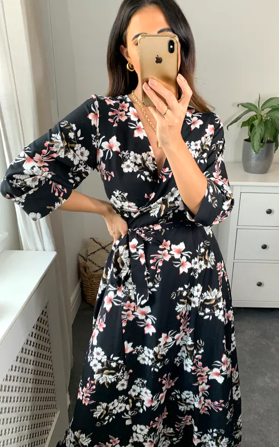 Your wardrobe refresh is here with our new black floral midi dress! Printed in a feminine floral pattern in black with white and pink. The wrap around shape is flattering for all body shapes. This dress is perfect for weddings, the races or any special occassion. Team this dress with some slip on open toe heels and a small bag to complement.