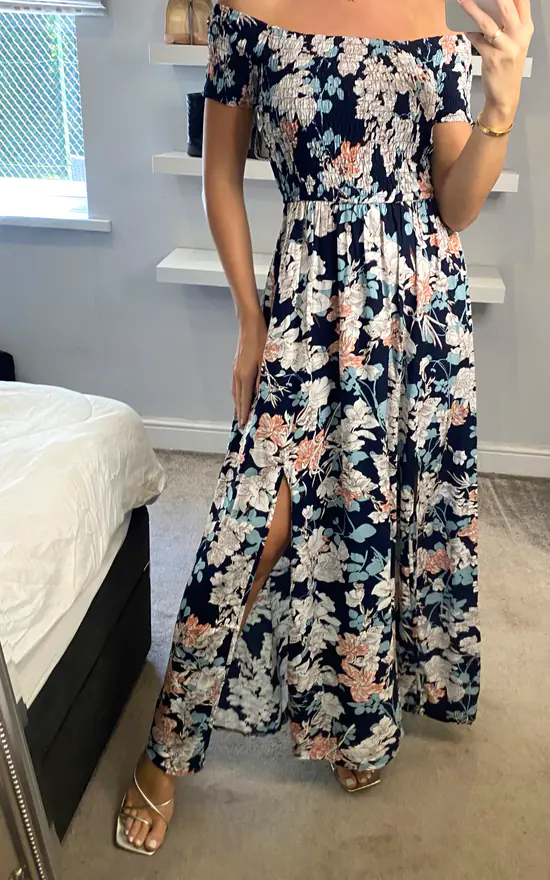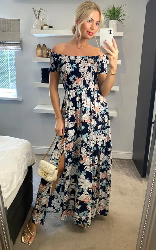 Stand out from the crowd in this floral off the shoulder dress. With a Bardot neckline, cap sleeves, a shirred bodice and a full length skirt with front split detailing. Pair with nude heels for a dressed up day look or dress down with flat sandals.