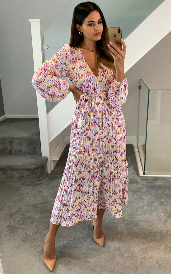 Harness laid back femininity in the abstract Fathomless Dress. An effortless long-sleeved silhouette that falls from the V-neck bust to a pleated calf grazing hem. Side zip and belt. 100% polyester