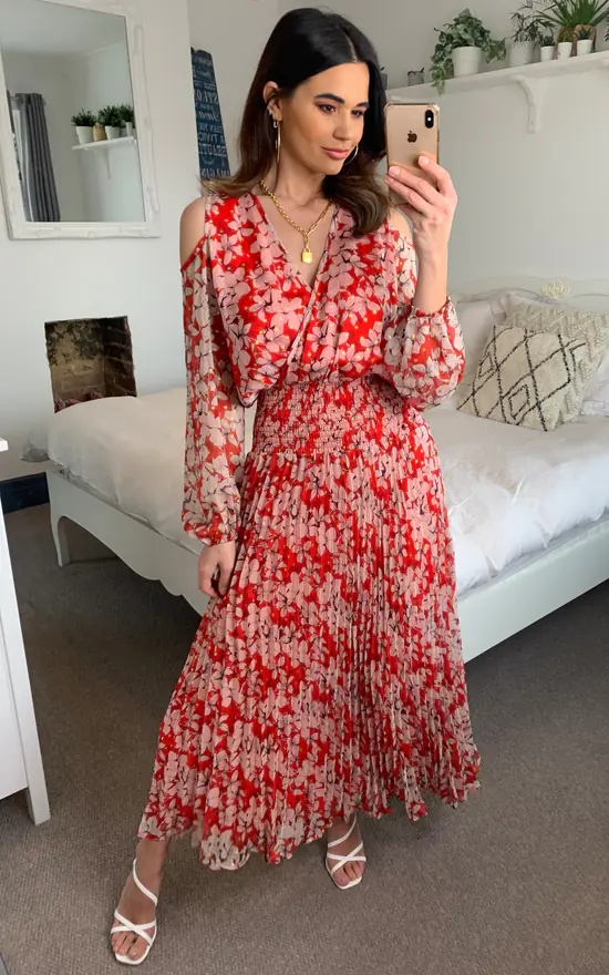 The Requim Dress captures a blend of modern elegance and vintage appeal. Crafted from lustrous chiffon, this open shoulder style is cut to a midi length and splashed in a dreamy floral making it easy to transition from day to evening.