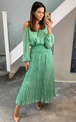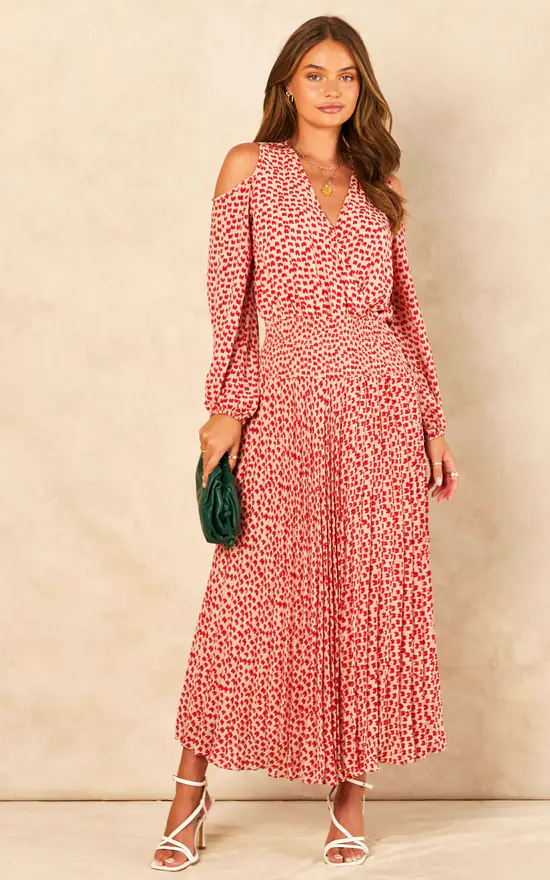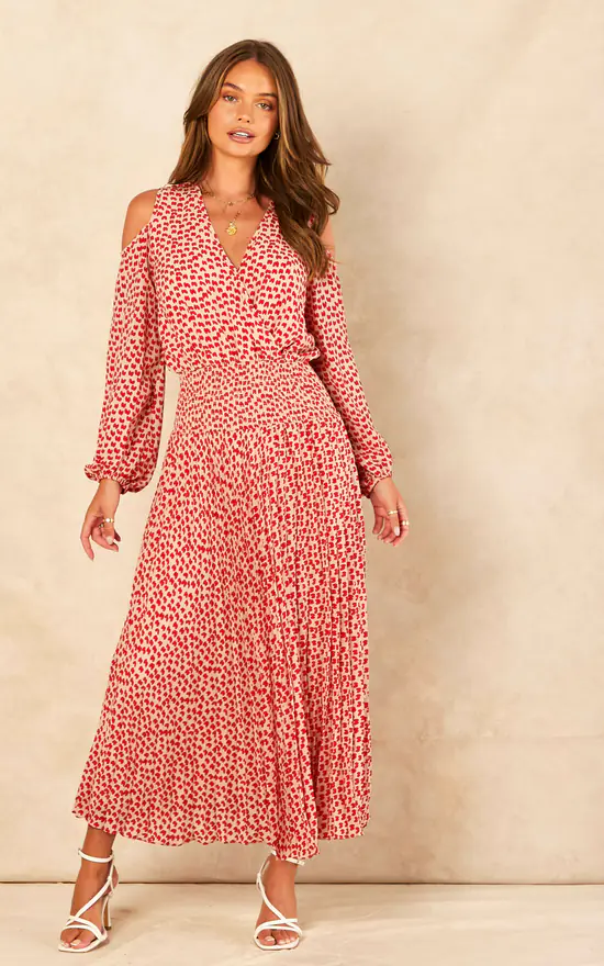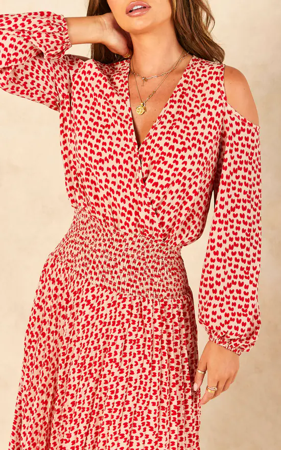 Our Trials and True Romance Requiem Dress couples a playful pattern with a soft tailored silhouette. Its sumptuous silhouette is elegantly tailored to feature cold shoulder, v-neckline and a gently flared midi hem.