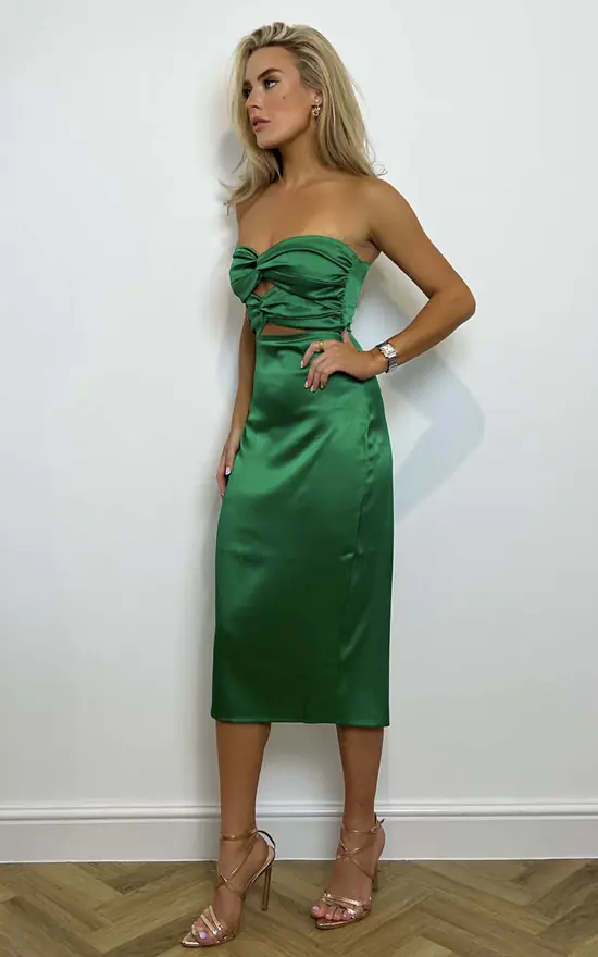 The new official date night dress is here, Vesper Santana Emerald Green Cut-out Midaxi Dress. Made from our new luxe satin fabric, this midaxi features a twist front cut-out with gathering details and an invisible centre back zip. Pair with black or nude heels and a small bag to complete the look.